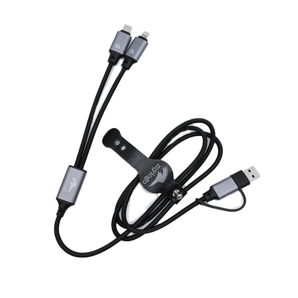 Ladda mycket - snabbare och smartare. Denna 4-i-1 ultrasnabba multiladdningskabel levererar upp till 100W PD-laddning (Typ-C till Typ-C). Med den smidiga adaptern kan du välja att använda USB-A eller USB Typ-C som input/inmatning. Tack vare de dubbla utmatningskontakterna stödjer den samtidig laddning av två enheter och synkroniserar data (datasync) sömlöst - allt i en hållbar, miljömedveten design tillverkad av GRS-certifierade återvunna material. Laddkabeln är kompatibel med Typ-C Carplay och övriga Apple-enheter.Gör tillval och sätt din logotyp på logoplattan av aluminium, samt lägg till och uppgradera produktens förpackning.